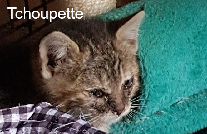 Tchoupette is a 2-month-old kitten that we found on the street a few weeks ago. Poor thing had a terrible upper respiratory infection and was in a very bad condition. We started her on treatment, but she still sneezes from time to time…