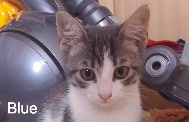 Blue est un chaton de 3 mois. Elle n'avait que 3 semaines quand elle a été trouvée, avec ses frères et soeurs, dans un tas de bois ! Ce sont leurs miaulements qui ont permis de les découvrir !