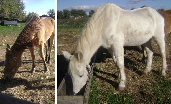 L’hiver, avec le froid, les chevaux ont systématiquement besoin de manger plus de granulés, mais cette forte consommation est encore accentuée dans les rangs d’Equi-Libre du fait que les chevaux pris en charge ont de gros besoins. Deux juments de 27 et 32 ans sont ainsi arrivées souffrant d’un amaigrissement important et très rapide qu’il faut absolument stabiliser en complémentant fortement leur ration de foin…
