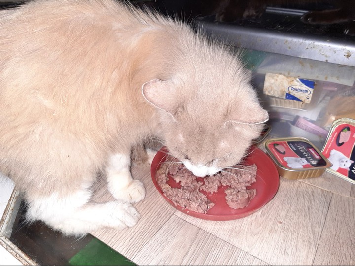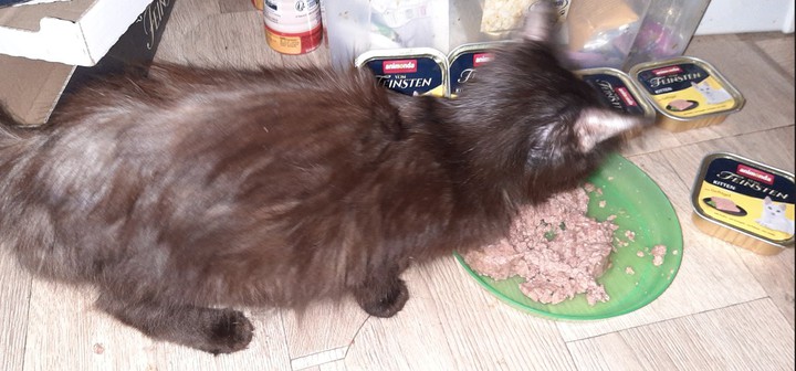 Tommy : Tommy threw himself on the swill, putting it everywhere as usual because of his mouth problems. But these good tins should fill him up a bit.