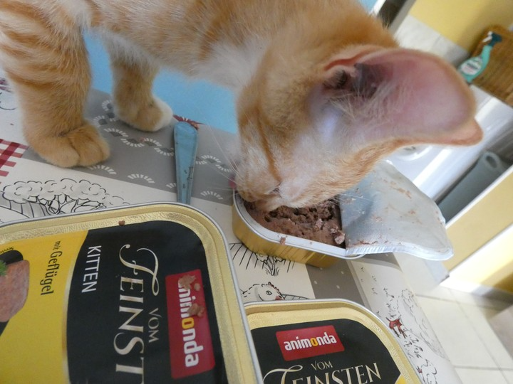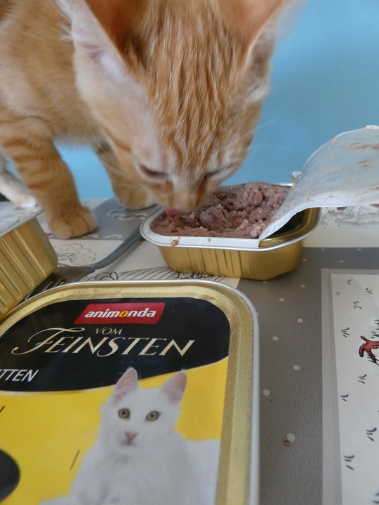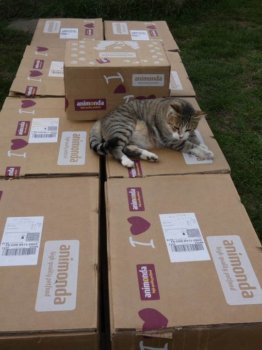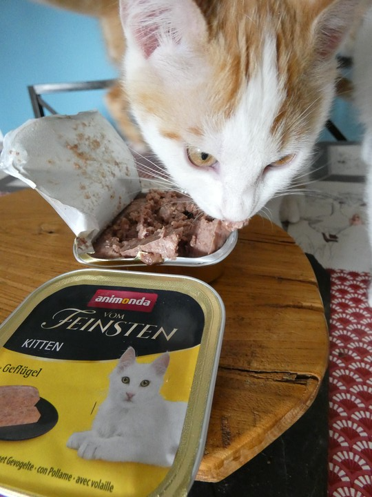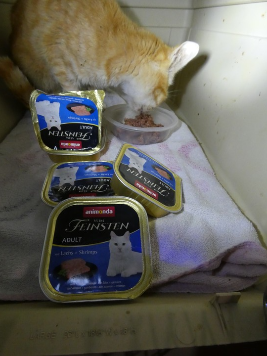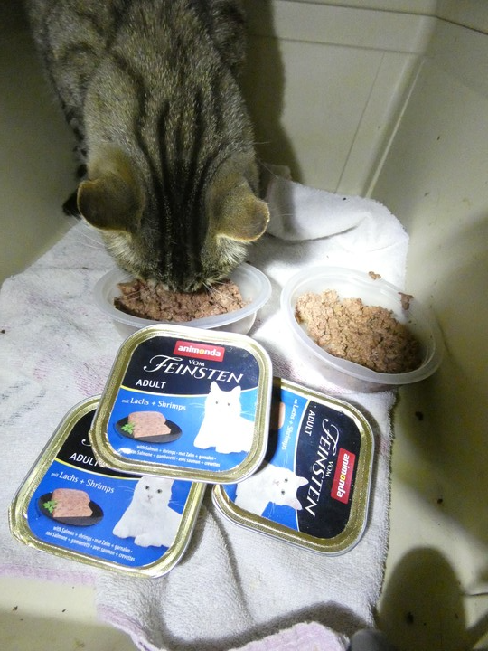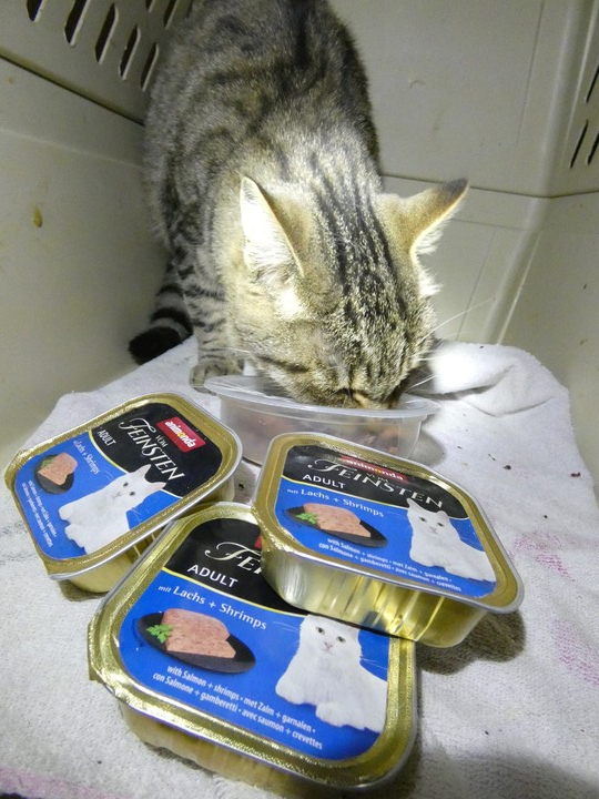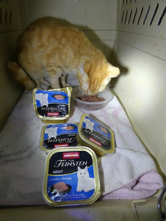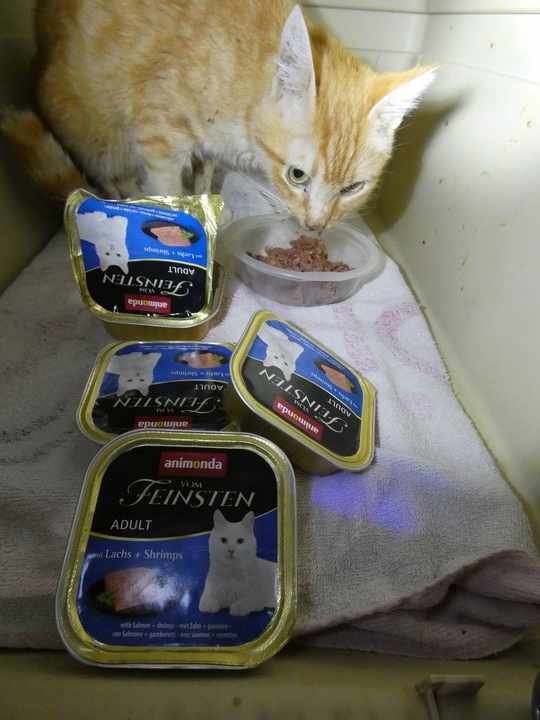 Casimir : Casimir was hospitalized again, in a catastrophic state. After leaving the clinic, he was able to regain his health thanks to the food you offered him. He enjoys it and eats at least three trays every day. I have to isolate him in a transport box so he ca