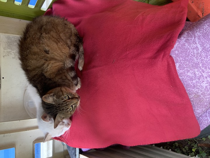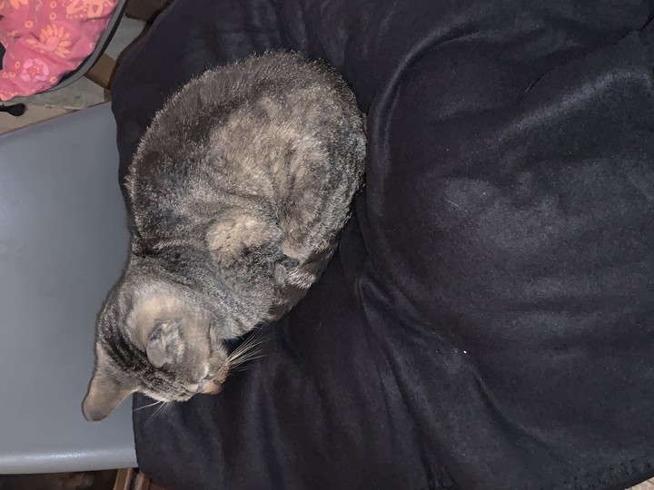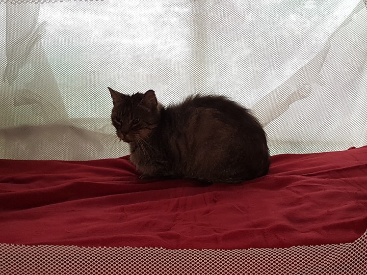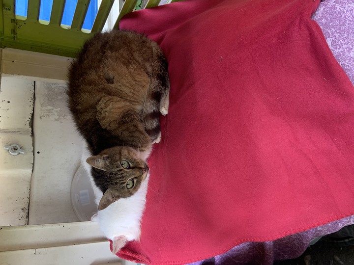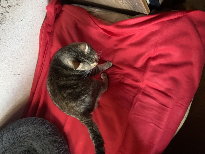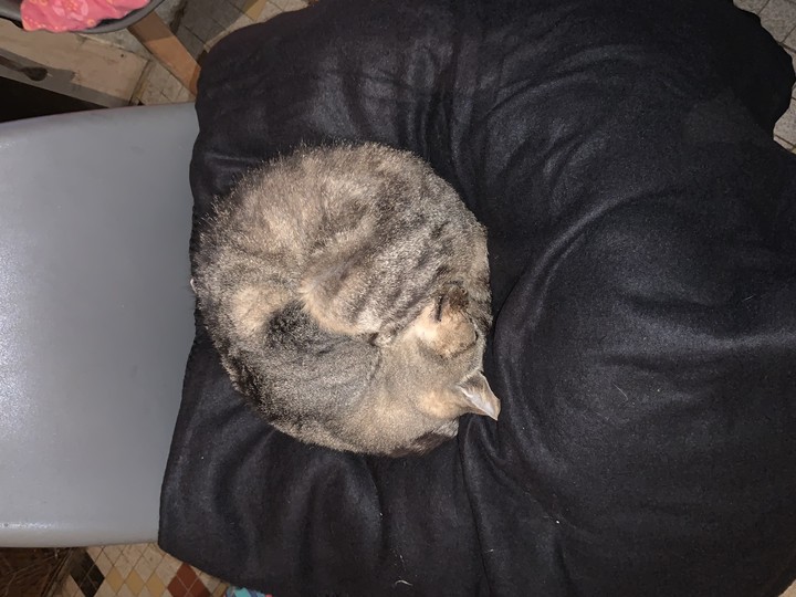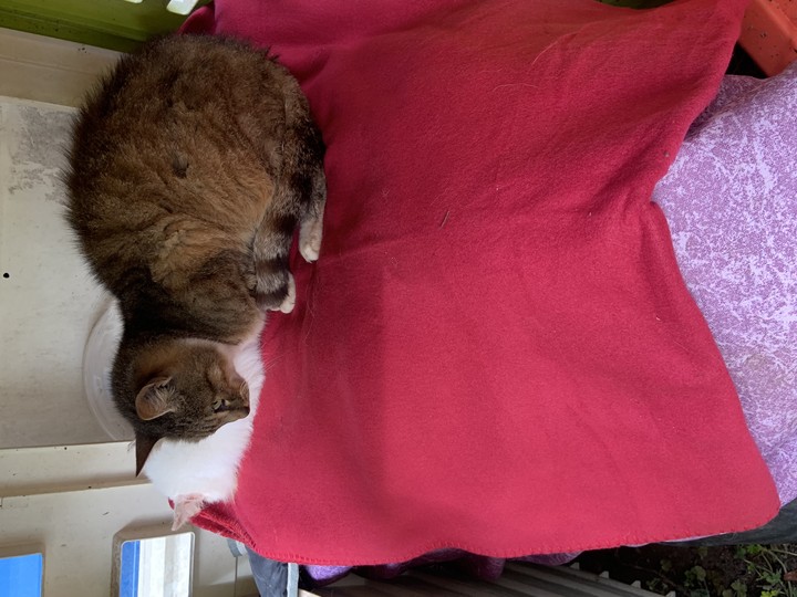 Titou : Titou really likes to lie on the blanket placed on a chair next to us. He is very fragile with his big health problems, but we take good care of him.