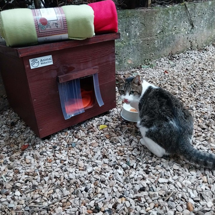 Batman : Batman has received his lot of blankets. His shelter was immediately equipped. His caregiver confirms that he uses it, sometimes alone, sometimes with another cat from his colony. However, it is difficult to take a picture of him in the shelter or with hi