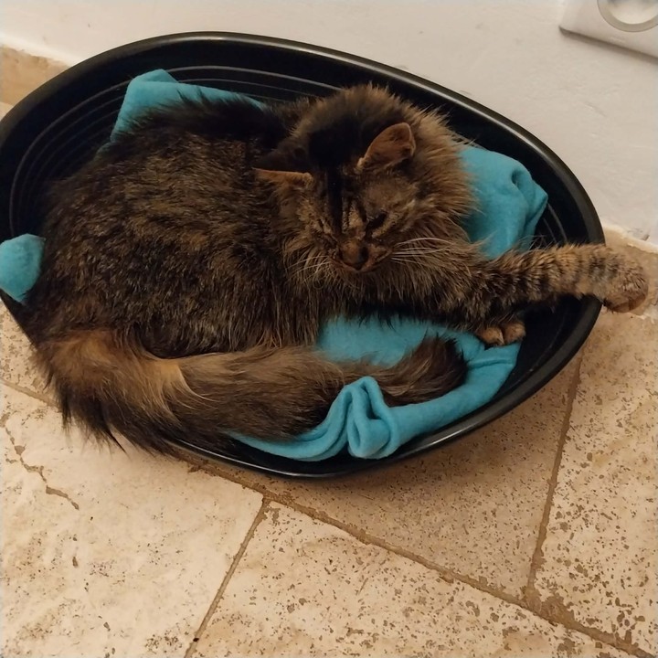 Nairobi : For our eldest Nairobi, there are good days and bad days. The days of great appetite (only for food or cottage cheese) and the "sparrow" days when she barely eats because of the calicivirus and saves her reserves as much as possible. She loves to snuggle