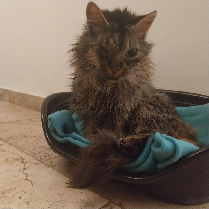 Terminator : Terminator, who was visually impaired and lived on the street, had a stroke. Completely blind since then, he has been placed in a foster family. He has adapted well to his new environment and enjoys the blankets.