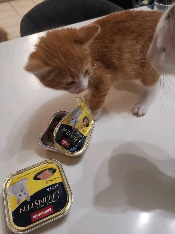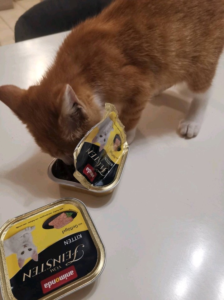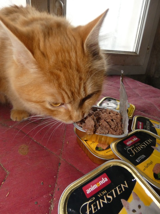 Réglisse : Réglisse is enjoying the food you offered him. We were able to treat his coryza by putting the treatment in the food. He has become a very beautiful cat with the particularity of having orange eyes.
