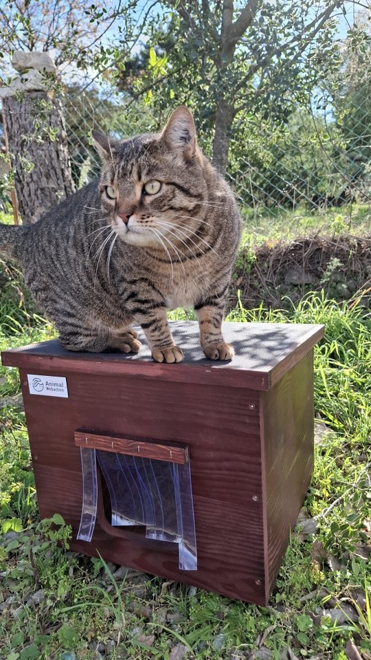 Praline : Praline was taken off the street due to the temperature and therefore temporarily sheltered in the garage of the person who was feeding her outside. She has a treatment for her mouth inflammation but is doing better. We are trying to take a picture of her with her new shelter in the garage while waiting to be able to put Praline back outside.