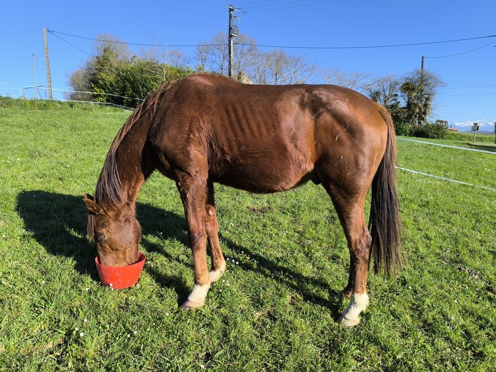 Jazz : The supply of pellets all winter has allowed her to regain condition and energy to fight against her health problems. We find a mare with a golden character although well tempered.