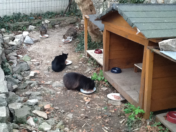 Les chats viennent tous les matins pour recevoir de la nourriture fraîche déposée par l'association dans le jardin . Elle laisse également à leur disposition des croquettes (environ 2kg ) qu'elle place dans l'abri pour les protéger de la pluie. Lorsque l'association revient le lendemain, les gamelles sont toujours vides (certains chats sont très méfiants et ne se nourrissent que lorsque aucun humain n'est présent). Une fois les gamelles vidées, les chats se dispersent dans la nature environnante ou dans le village où ils trouvent des abris précaires.