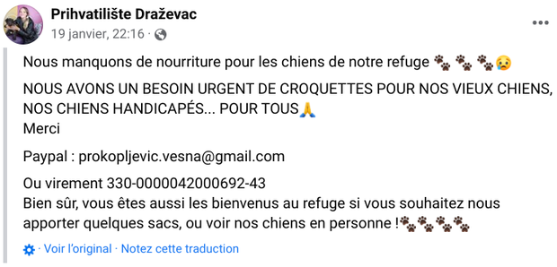 Si vous souhaitez passer au refuge de Vesna pour l'aider ou que vous voulez lui envoyer directement des croquettes ou un chèque , contactez Vesna via la page de l'association sur Facebook. (Note : l'aide directe se fait sous votre entière responsabilité.)