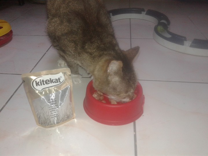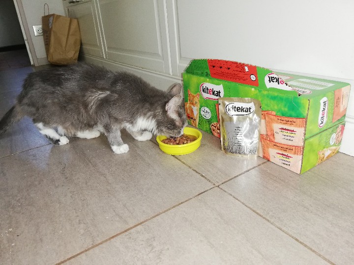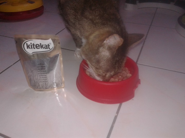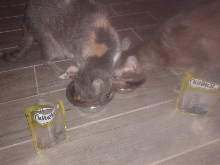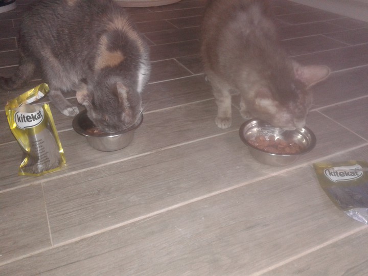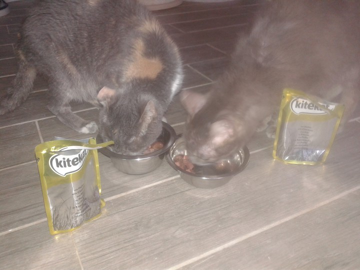 Esmeralda : Mamie Esmeralda à gauche, accompagné de son vieux copain Stitch, a plongé le nez dans sa gamelle et a tout mangé. Esmeralda n'a plus de dents et les sachets kitekat sont faciles à manger et très appétents. Merci beaucoup!