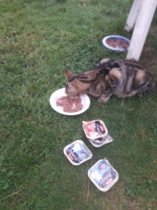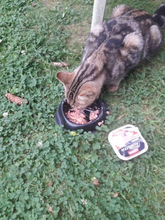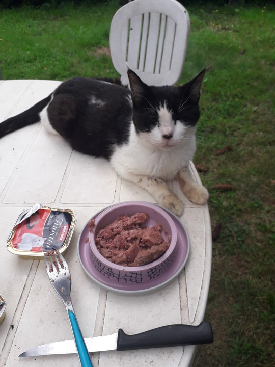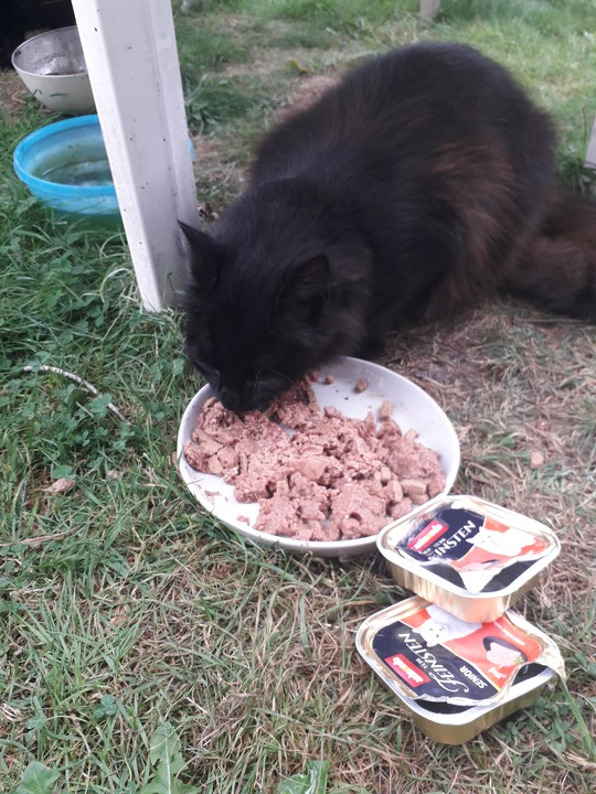 Plumeau : Je vous laisse regarder Plumeau qui mange sa pâtée avec bonheur. Encore une fois, nous tenons à remercier tous ceux qui ont participé à nos collectes et vraiment, quand on voit comment il se comporte après avoir mangé, je peux vous dire que la nourriture l'a vraiment réconforté. Merci beaucoup