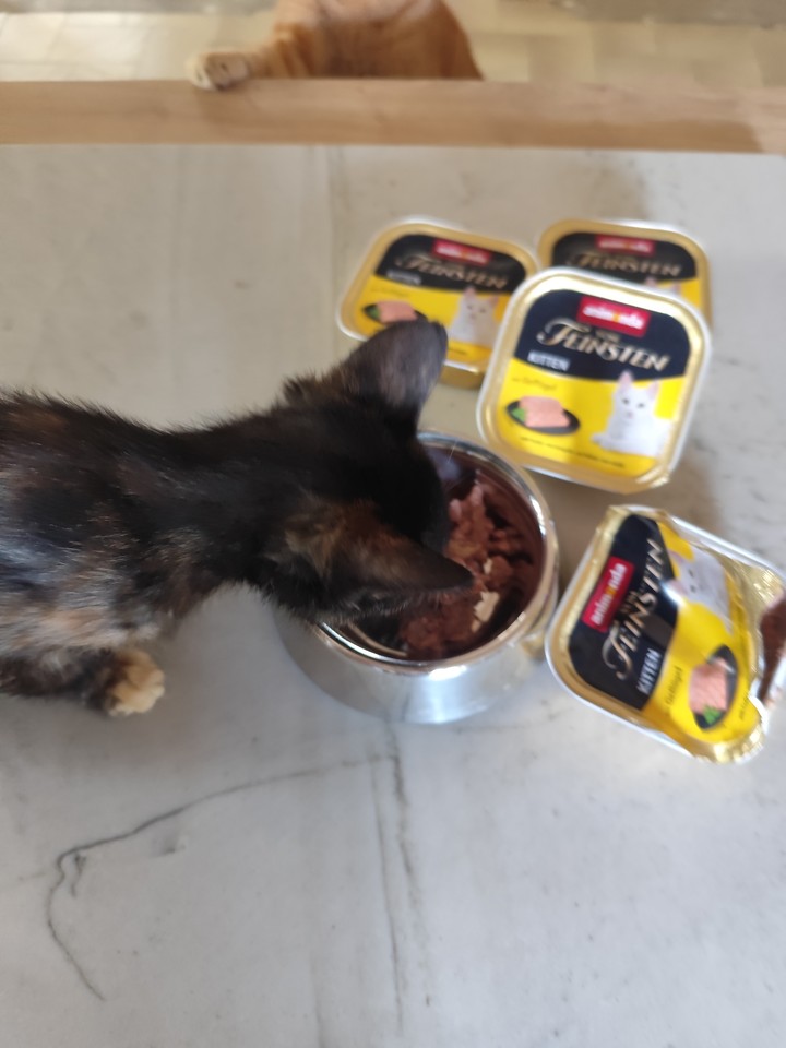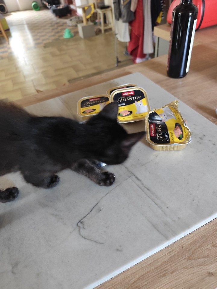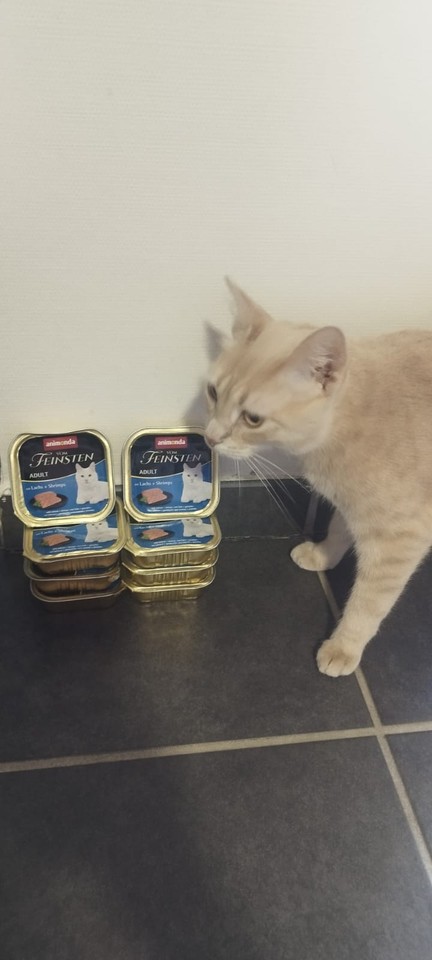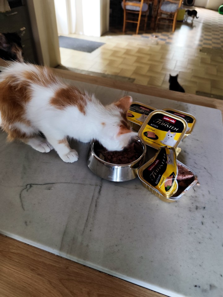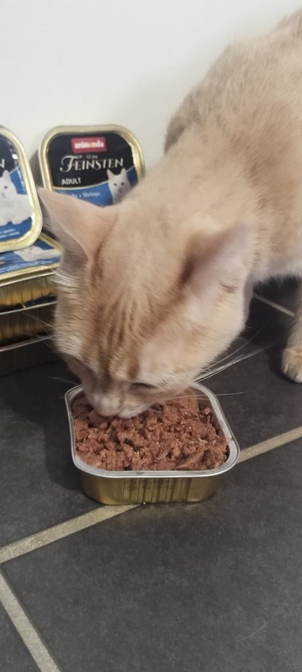 Mia : Mia se régale des boîtes ! Elle n’hésite pas une seconde à se jeter sur sa gamelle tant aimée ! De par son passé de maltraitance, elle est compliquée à prendre en photo, mais elle progresse bien et la pâtée l’aide à nous accorder sa confiance.