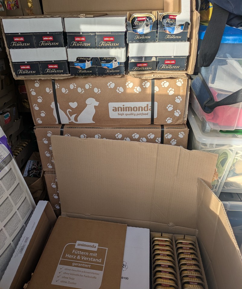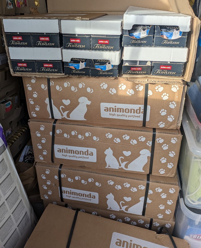 Oro : Oro, notre charmant petit noir et blanc qui est arrivé cet été au refuge très affamé, ne laissera pas sa part de Animonda à ses copains de panier. Heureusement grâce à toutes les barquettes reçues, il y en a pour tous.