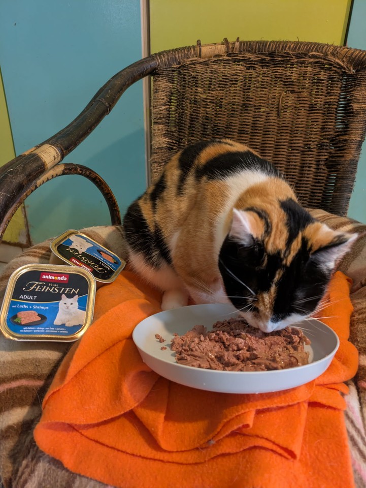 Vahiné : La pauvre Vahine qui a tellement souffert et reste traumatisée et craintive attend d'être seule pour manger, on ne sait pas ce qu'elle a pu vivre pour avoir ce comportement, mais les barquettes Animonda, elle adore.