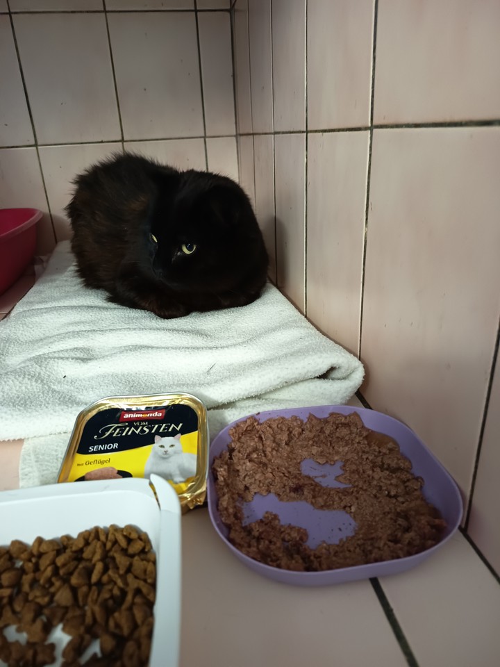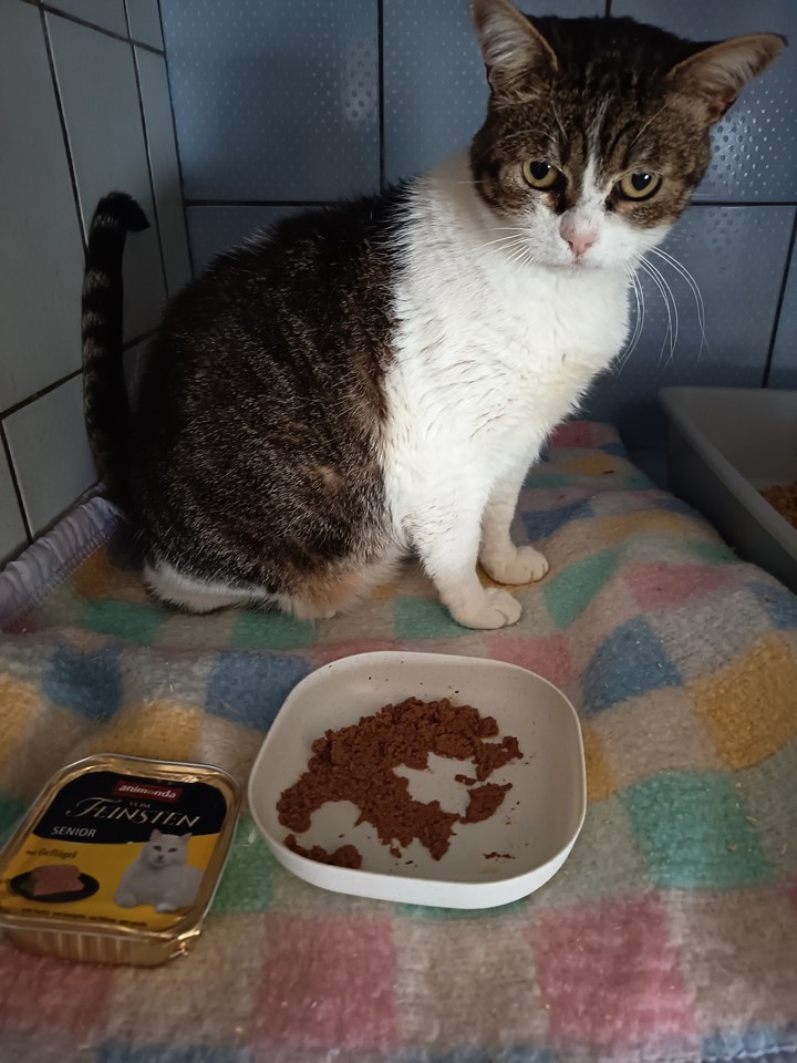 Minouille : Son œil coule encore un peu, mais ça va beaucoup mieux. Elle a quand même pu retrouver un foyer aimant. Le refuge n'était pas facile à son âge.