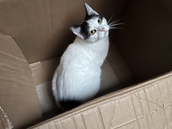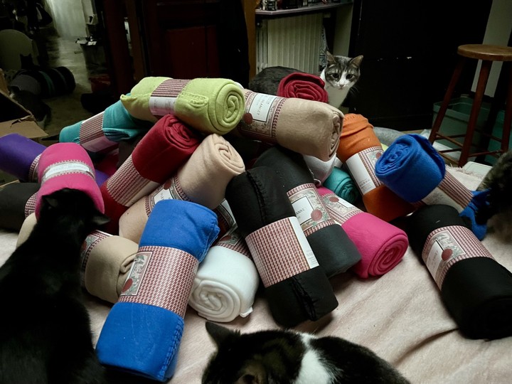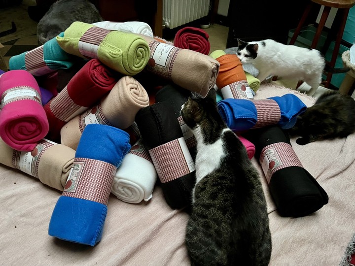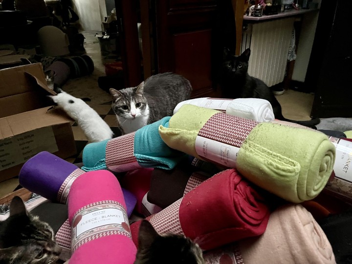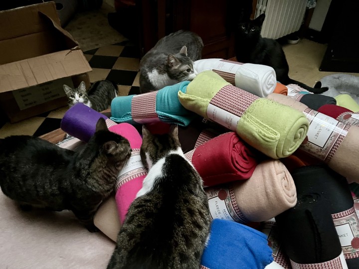 Un grand merci 🙏❤️ à tous les internautes qui ont cliqué et fait des dons pour que nous puissions réussir ces collectes de couvertures, notamment pour garnir les niches de nos chats libres. Lors du déballage des colis, les chats sont venus "inspecter la marchandise". Flocon, quant à lui, a préféré explorer les cartons. 😺