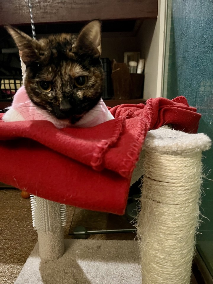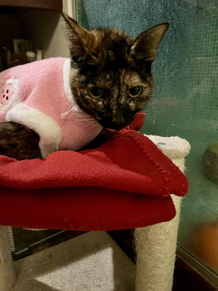 Tsuco : Pas vraiment d'évolution, malheureusement, mais elle garde la volonté de s'en sortir ! Comme elle a perdu beaucoup de poids, elle apprécie beaucoup d'être emmitouflée dans une bonne épaisseur de couverture bien moelleuse. Elle s'y pelotonne et n'en bouge plus. On lui a également mis un body pour l'aider à se réchauffer. Petit cœur, courage ❤️🩹 !