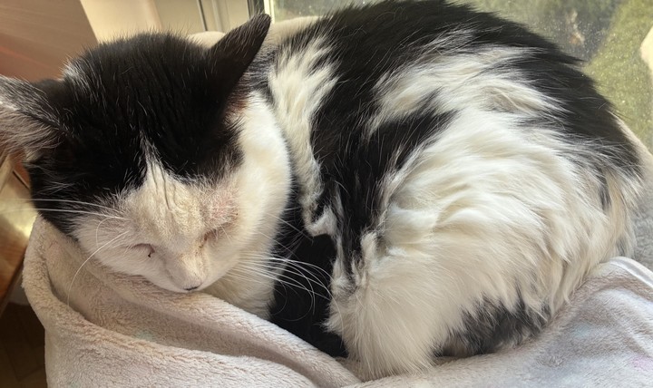 Sawyer : Malheureusement, notre Sawyer ne va guère mieux, il décline doucement. 🥲 Heureusement, sa FA, de qui il est très proche, veille sur lui avec tendresse. La rue détruit, faites stériliser vos chats. 🙏