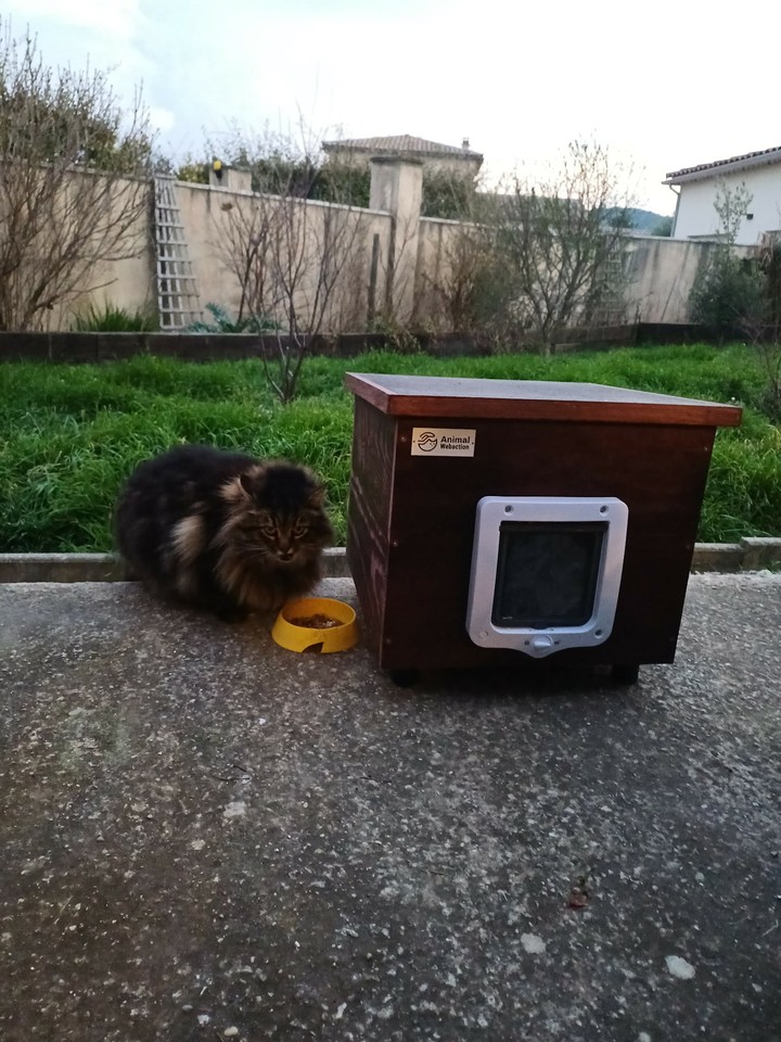 Pupuce : Pupuce a découvert la niche tout doucement. Elle n'y entrait pas au début, mais un autre chat de sa colonie, plus sociable, lui a montré le chemin. Pupuce, depuis, s'y réfugie sans problème. Il a juste fallu qu'elle soit rassurée en voyant un autre chat utiliser la chatière avant de se lancer ! Un grand merci pour elle ! Depuis, nous avons ajouté une palette en dessous.