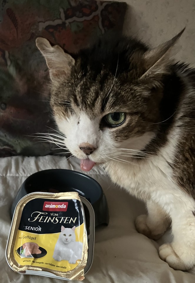 Merlin : Depuis sa prise en charge par notre association, Merlin est désormais chouchouté et réconforté en toute sécurité dans une famille d'accueil, ce qui lui a permis de reprendre petit à petit des repères et d'apprécier la dotation de barquettes pour séniors.
