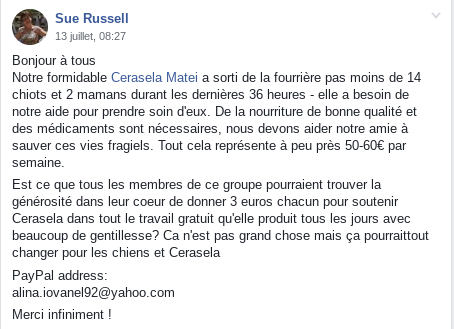 Seulement voilà : entre les frais vétérinaire, le nourrissage des chiens déjà présents chez elle et l'achat des croquettes, Cerasela n'a plus les moyens de suivre ce rythme effréné... A bout de forces et de moyens, elle nous appelle à l'aide pour continuer de sauver les chiens et leur éviter une mort certaine derrière les barreaux de la fourrière municipale !