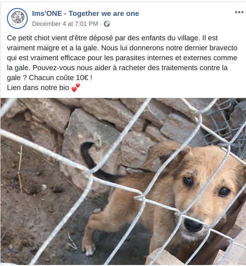 Toutes deux expatriées et investies à 300% dans la protection animale au Maroc, Fanny et Lucy ont littéralement tout plaqué, et consacrent absolument tout leur temps au refuge. Elles se contentent du minimum et vivent dans des conditions très précaires, mais leur sacrifice ne suffit pas à dégager des ressources pour acheter des croquettes !